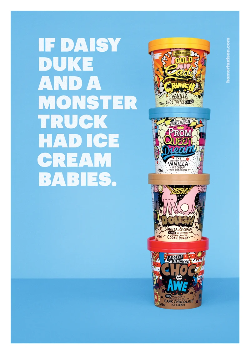 After two years of planning, creating and tasting with The Monkeys and their partners Maud, they put Homer back on the shelves. Renowned UK artist, Serge Seidlitz created the limited edition art on every tub, bringing each flavour name to life with a colourful pop culture diorama.