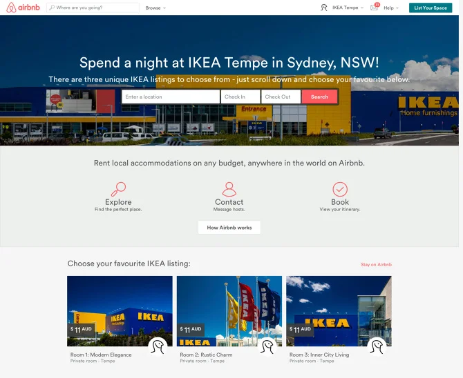 IKEA + Airbnb To raise awareness of IKEA bedroom solutions we invited Australians to spend the night in one of the most iconic buildings in the world – the big blue box. Yes, we transformed IKEA Tempe, in Sydney, into a fully functioning Bed and Breakfast. We created three unique listings on Airbnb to showcase the range, plus communal areas for guests, a central dining table and hang-out rooms for kids.