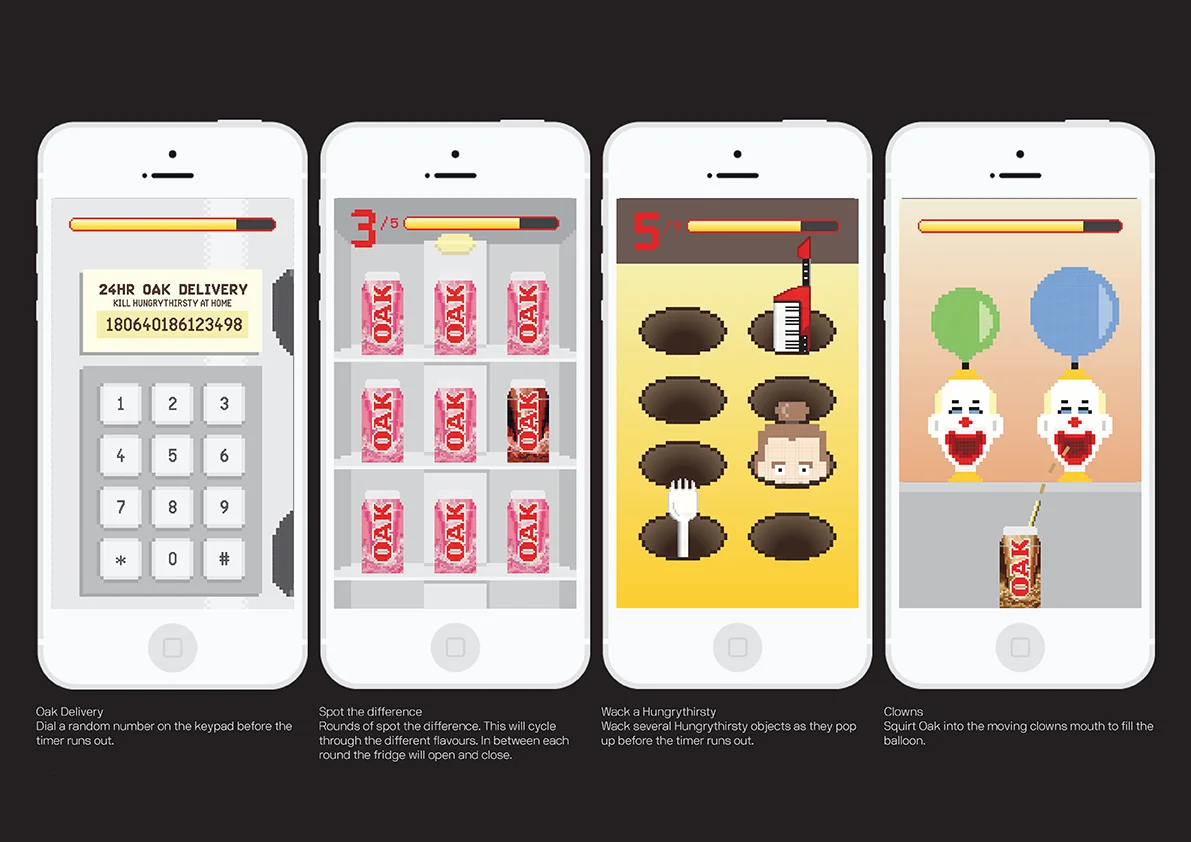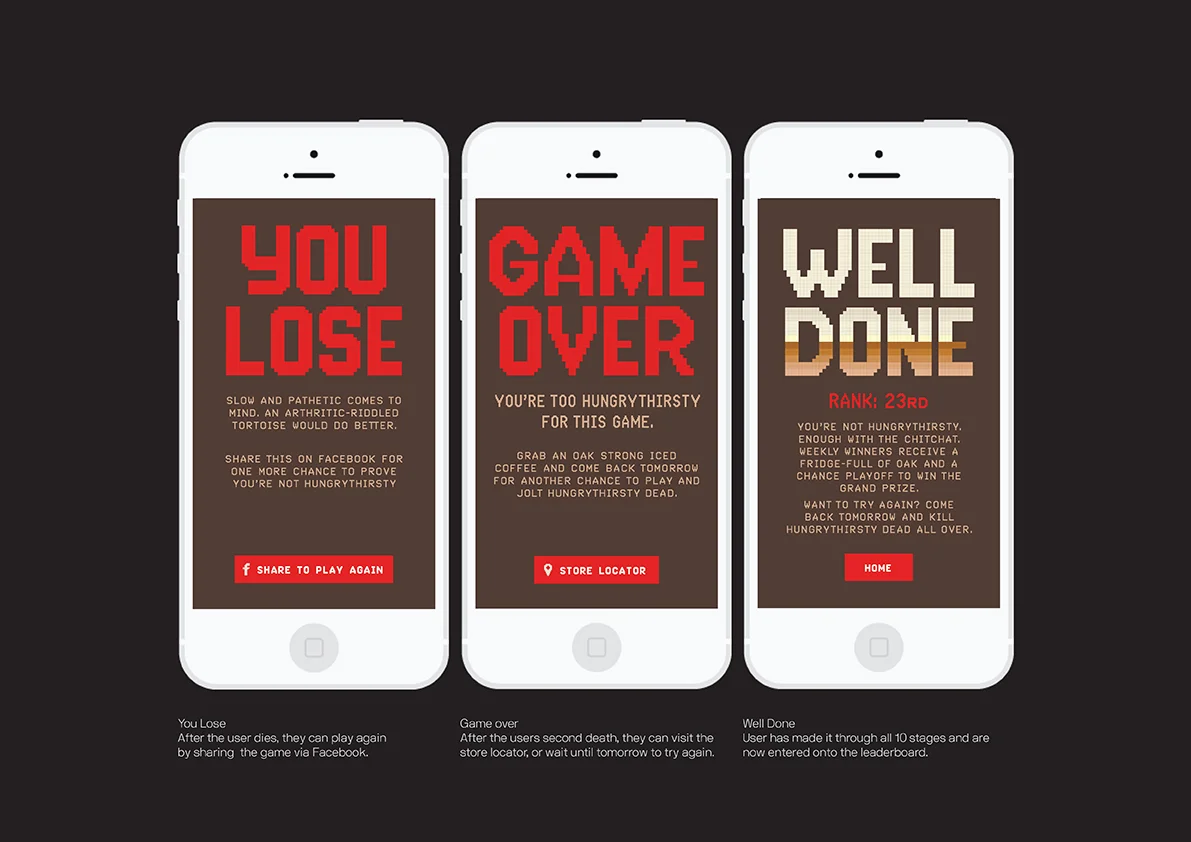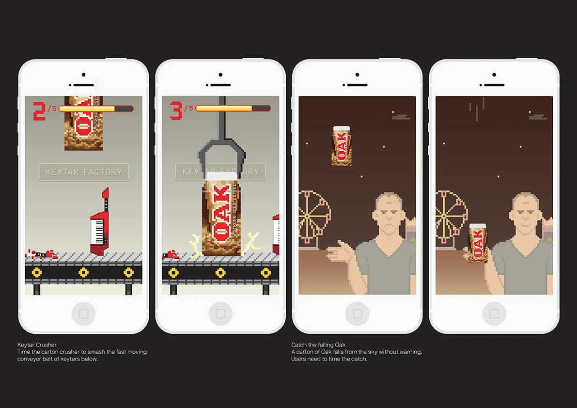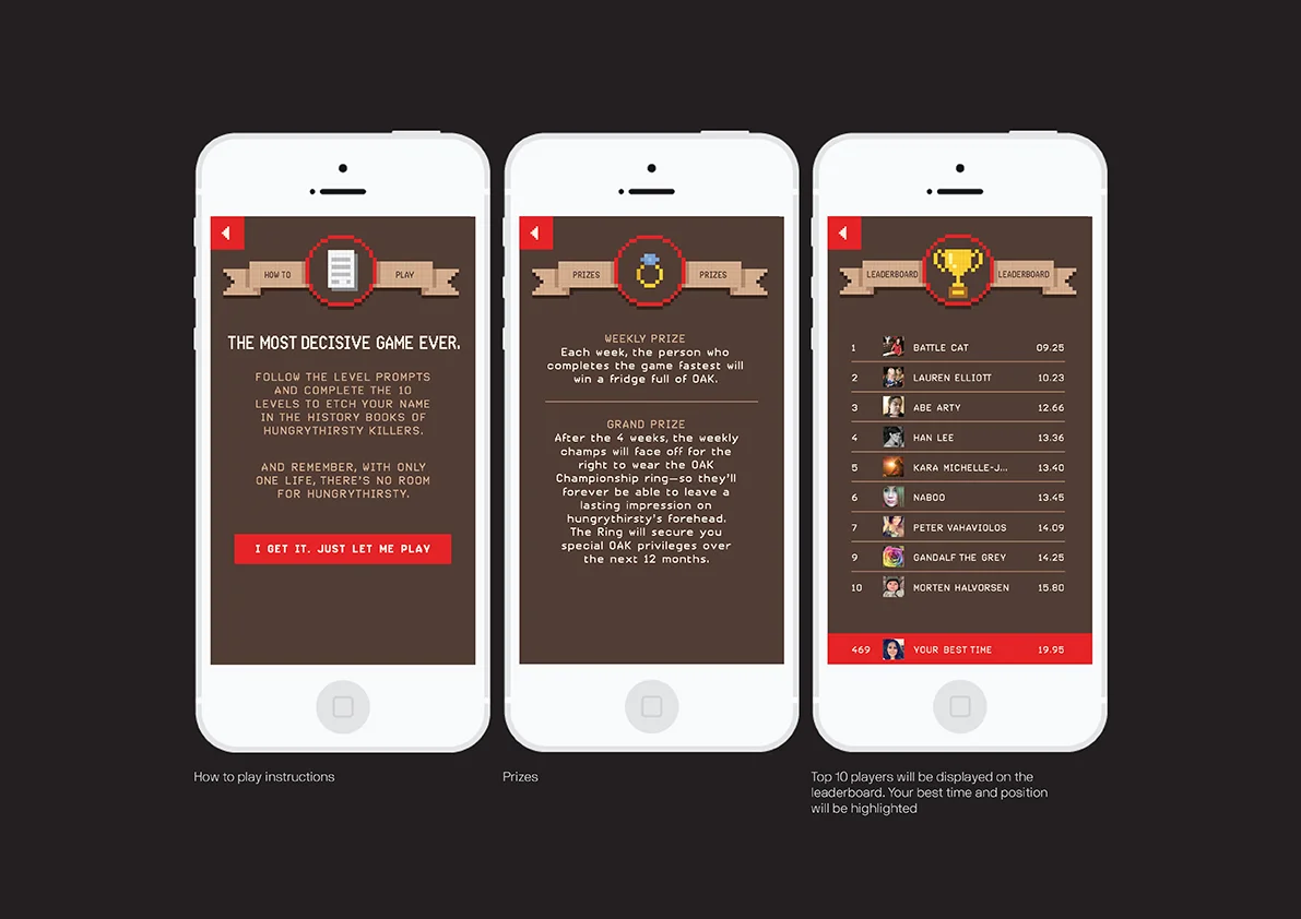 To launch OAK Strong Iced Coffee, we created the ultimate reaction game that tasked our fans to prove that they’ve filled the empty hole left by hungrythirsty with decisiveness. With one life, and one life only, fans had to finish the 10 level game to prove they were the ultimate hungrythirsty killer. The winner received an 18 carat gold plated OAK Championship ring, and 12-months of money can't buy OAK privileges, such as first trials of new products.