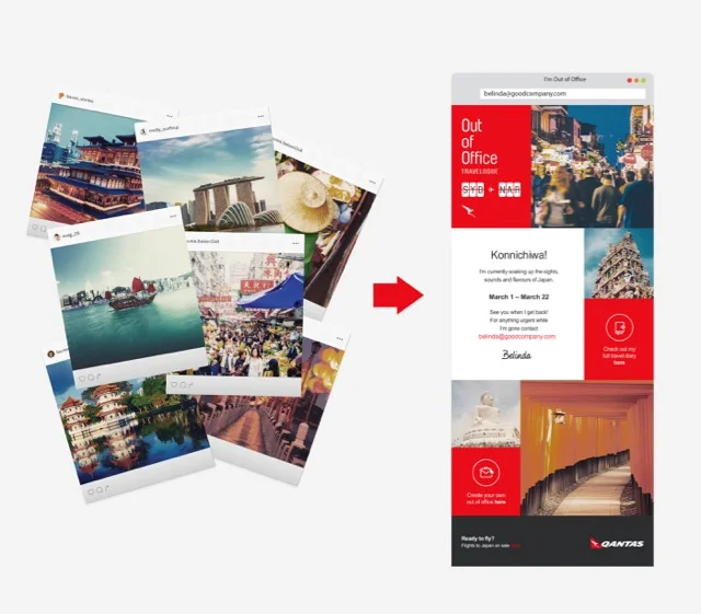 The Qantas Out of Office Travelogue connects your email to your Instagram and updates your auto reply email with photos you select and tag with #qantasoutofoffice. When someone emails you while you’re travelling, they’ll receive an email showcasing the latest photos from your travels.